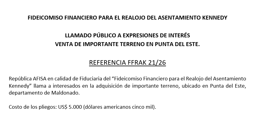 FFRAK 21/26Venta de importante terreno en Punta del Este Abierto Estado: Disponible Fecha publicación: 03/03/2026 Plazo presentación: 16/04/2026 12:00hs Archivos disponibles: 01.Pliego General de Condiciones 02.Pliego Particular de Condiciones 03.Anexo I - Plano 04.Anexo II - Normativa padrón 11.603 FFRAK 21/26Venta de importante terreno en Punta del Este Asen.Kennedy Archivos disponibles: 01.Pliego General de Condiciones 02.Pliego Particular de Condiciones 03.Anexo I - Plano 04.Anexo II - Normativa padrón 11.603